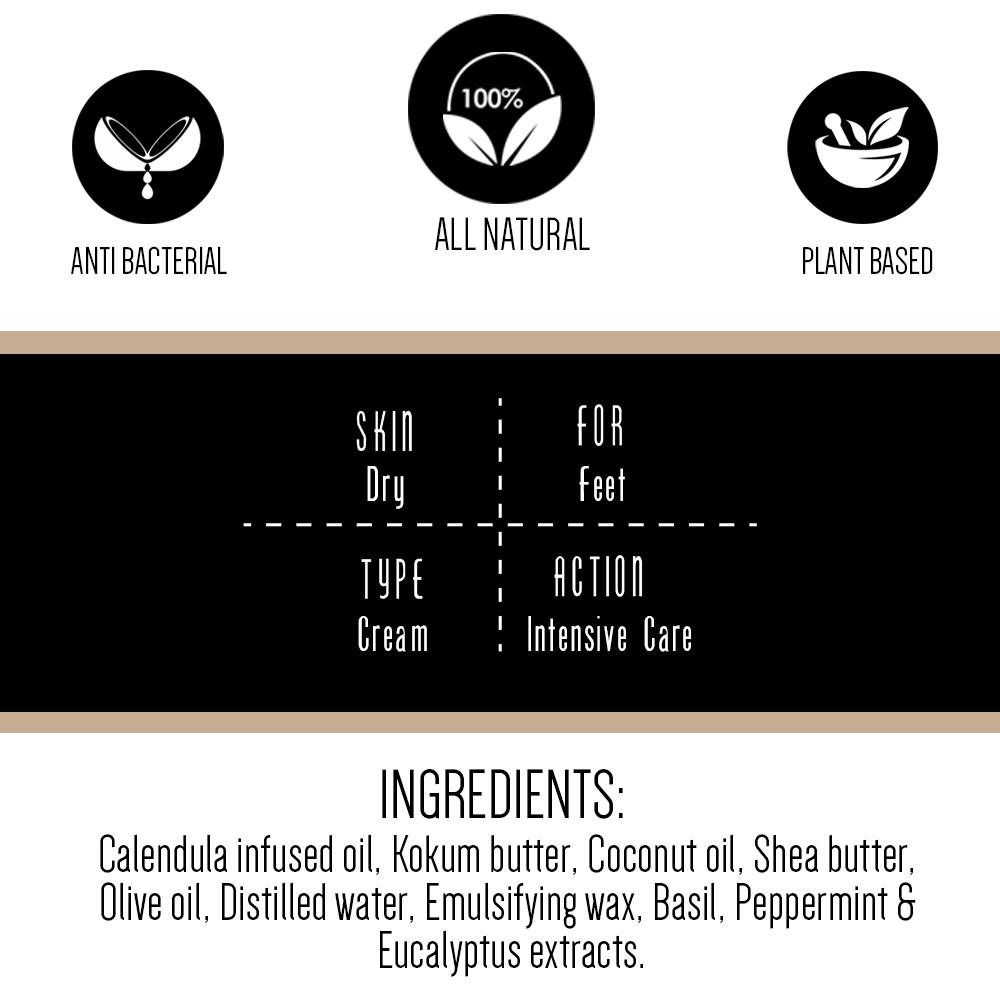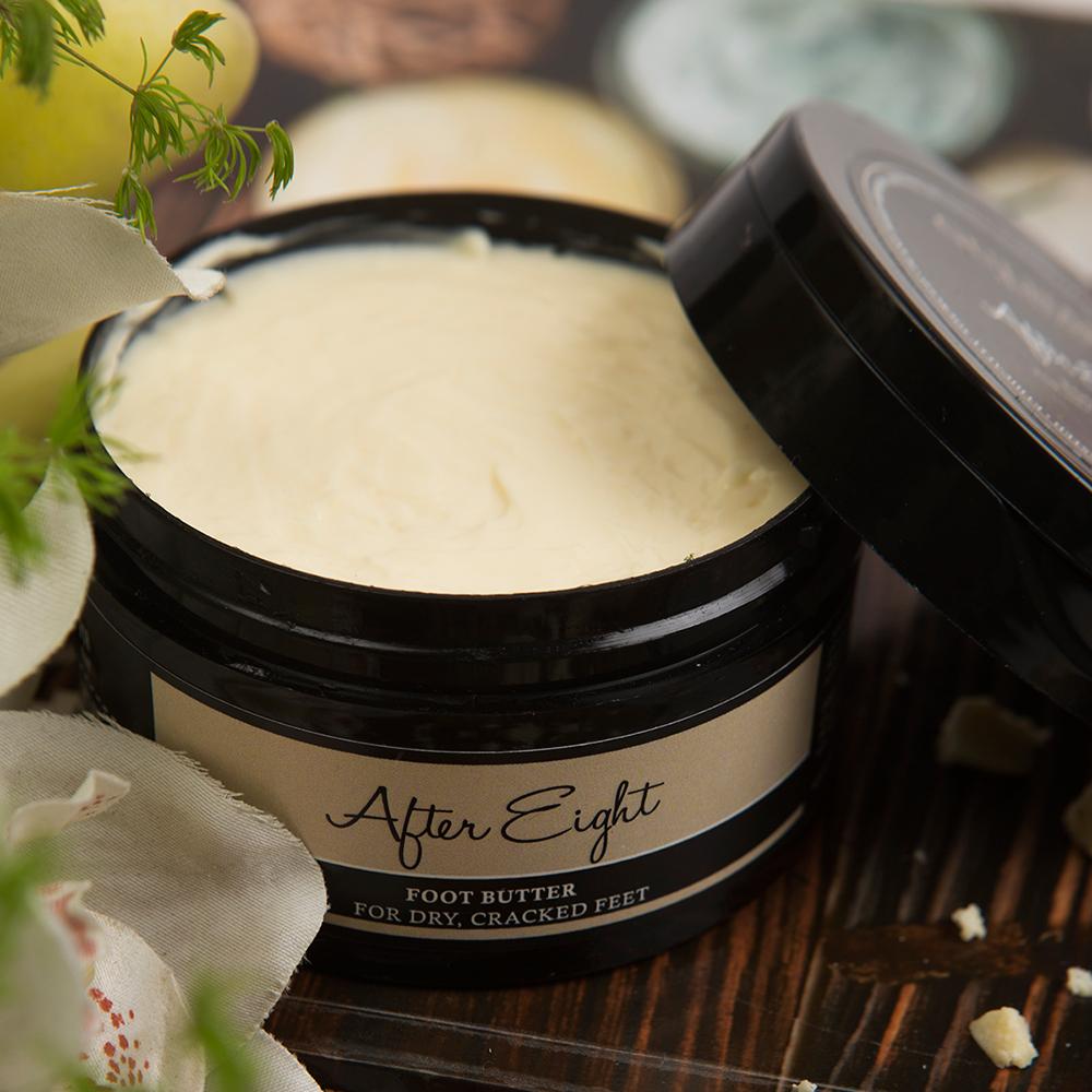 After eight foot cream is a velvety smooth butter containing potent and effective natural herbs to help heal and prevent dry, cracked and callused skin. This valuable combination of soothing Calendula infused Coconut oil and Kokum butter soothe, heal, & soften your skin while a refreshing blend of antibacterial Peppermint & Eucalyptus revitalise & relax tired and aching feet.