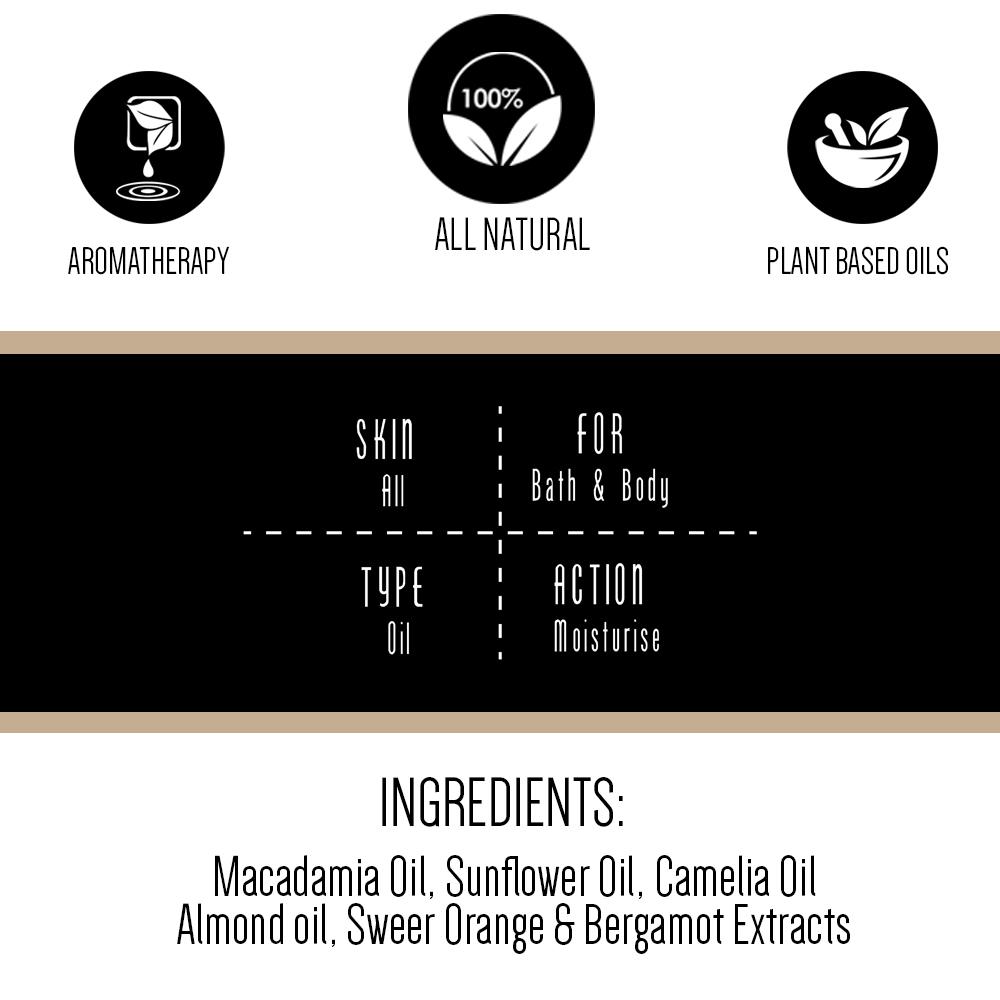 Rise & Shine Bath and Body oil is made with a special aromatherapy blend that will uplift your mood and energise the body so you can emerge from the bath happy , refreshed & ready for a long day’s work. The uplifting essential oils of sweet orange, Geranium & Bergamot combine with nourishing Macadamia & Camellia oil to create this indulgent formula of pure goodness. Packed with vitamins and minerals, this body oil moisturises the skin, prevents dullness and promotes a natural glow.