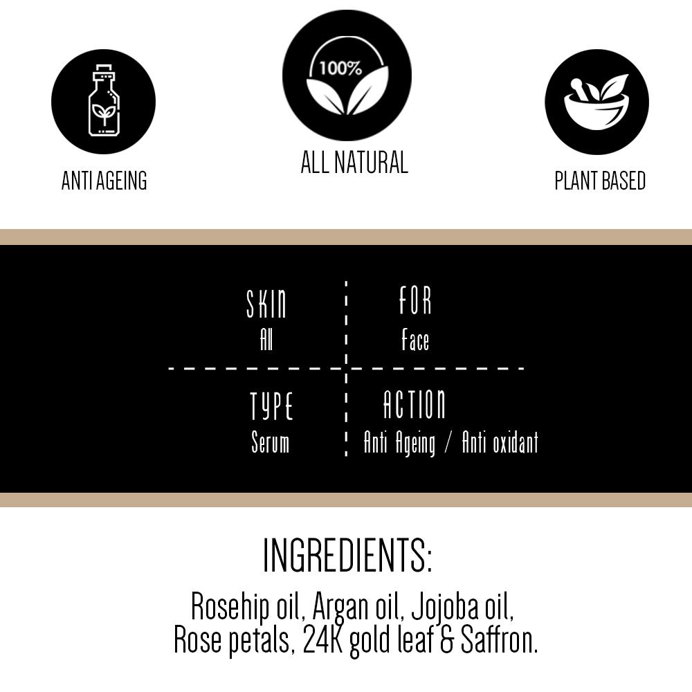 Add a touch of luxury to your beauty ritual with Goddess facial oil. Infused with 24K carat Gold, Saffron & Rose petals, it deeply nourishes, conditions, and protects, leaving skin with a glossy, silky sheen. The formula locks in moisture, delivers antiaging benefits, and restores the skin’s glowing softness, elasticity, and comfort.